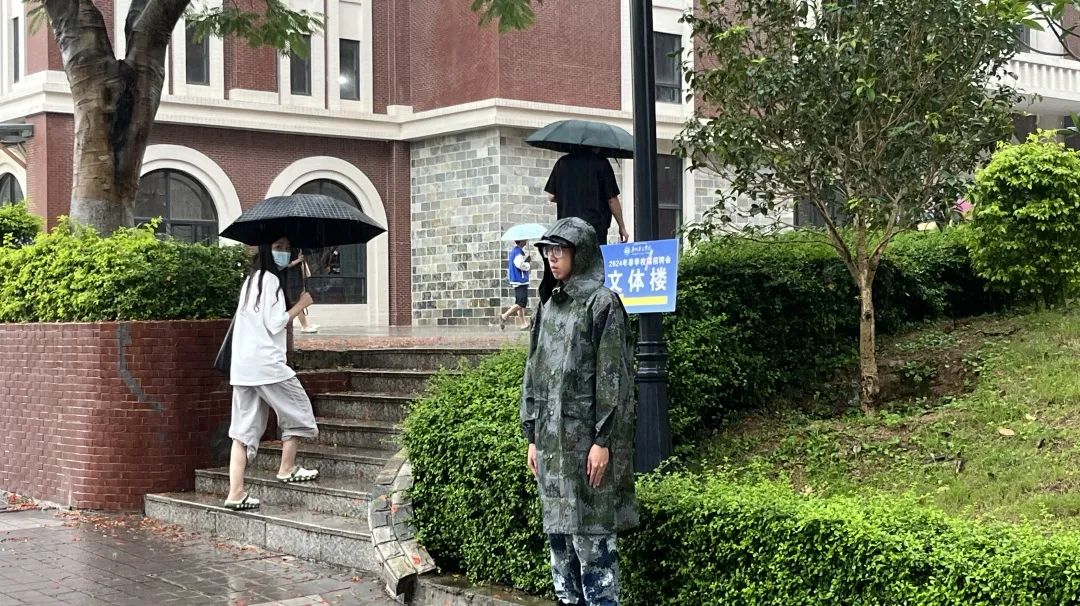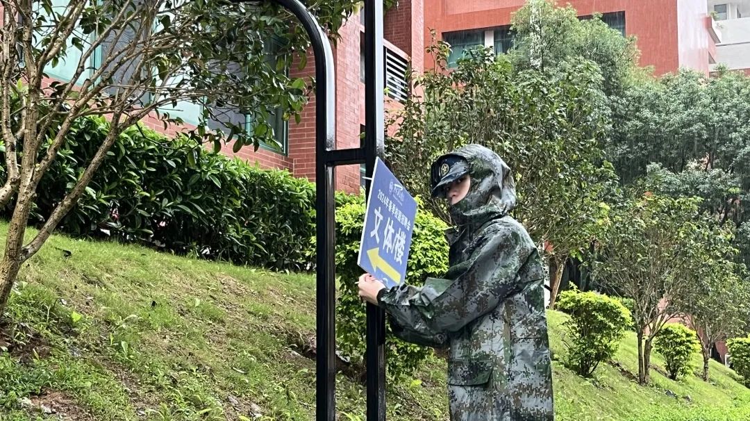 即使大雨滂沱,国防教育志愿者们依然毫不退缩,在雨中指挥着大家前往招聘会的路。他们为怀揣梦想的年轻人指引方向,给阴霾的天空带来了一丝温暖与希望。