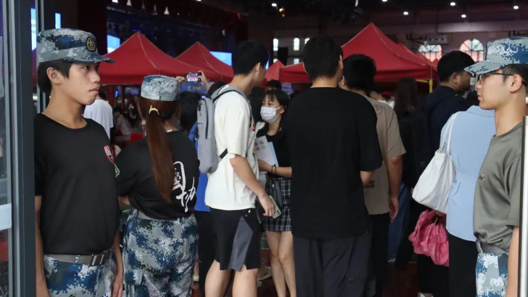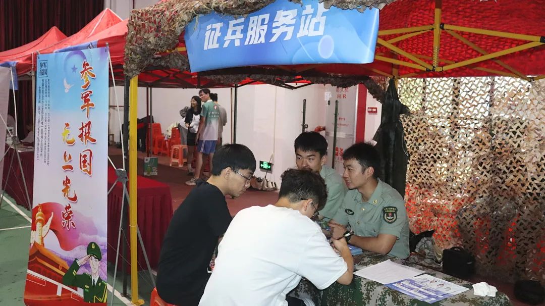 人头攒动,学生们络绎不绝地涌来。身着军装的国防教育志愿者们为有意向的同学答疑解惑。摊位上整齐地陈列着征兵宣传资料,展现着军队的威武与荣耀。许多学生驻足观看,在心中描绘着属于自己的军旅蓝图。
