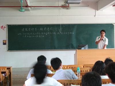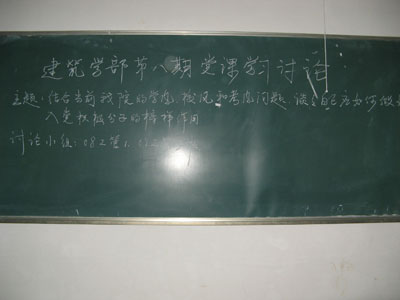 6月2日12:45分,部分申请入党的同学们齐聚一堂,展开了一场主题为“结合当前我院的学风、校风和考风的问题,谈谈自己应如何做好入党积极分子的榜样作用”的讨论会。此次讨论会由来自08级各班的团支书们共同主持,同时还请了一些来自07级的已经加入了党的师兄们发表了自己的见解。其中来自07土木1班的黄传金师兄引用了胡书记的名言:一个有远见的民族总是把关注的目光投向青年,一个有远见的政党总是把青年看作推动历史发展和社会进步的重要力量。他希望这句话能提高同学们入党的积极性,坚定他们加入中国共产党的决心。接着,一场别开生动的讨论会正式开始。