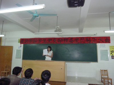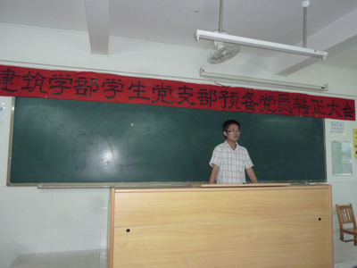 2010年6月2日我学部在二号楼308举行了建筑学部党支部预备党员转正大会,出席会议的有黄淑贤书记等63名党员。会议由陈静老师支持。会议一共分四个流程: