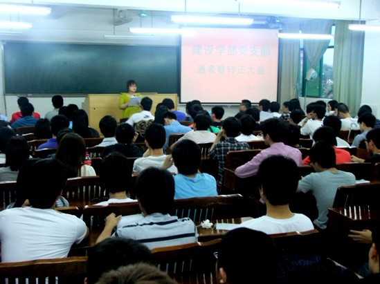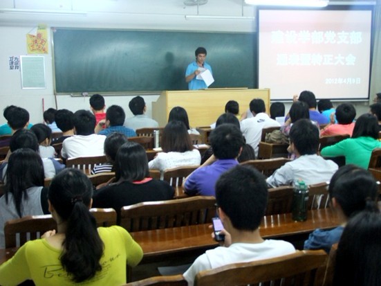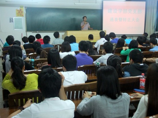 2012年4月10日,建设学部学生党支部于第二教学楼408隆重召开建设学部学生党支部通表暨转正大会,有张建东等8名同志进行通表,邓迪等3名同志转正,建设学部党支部书记黄叔贤、指导老师郭花、邹小丽老师及学部全体学生党员出席了本次大会,会议由指导老师郭花主持。