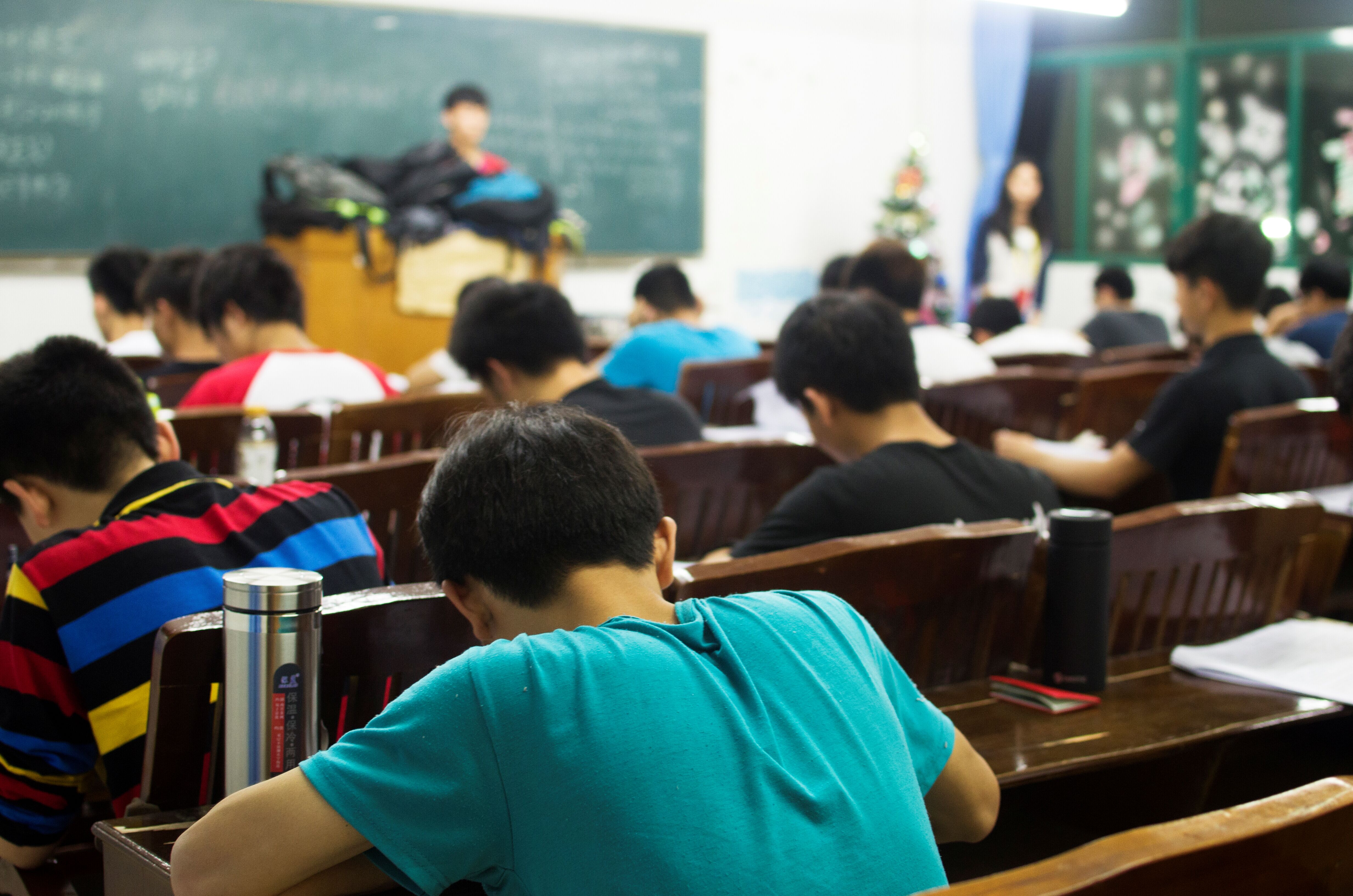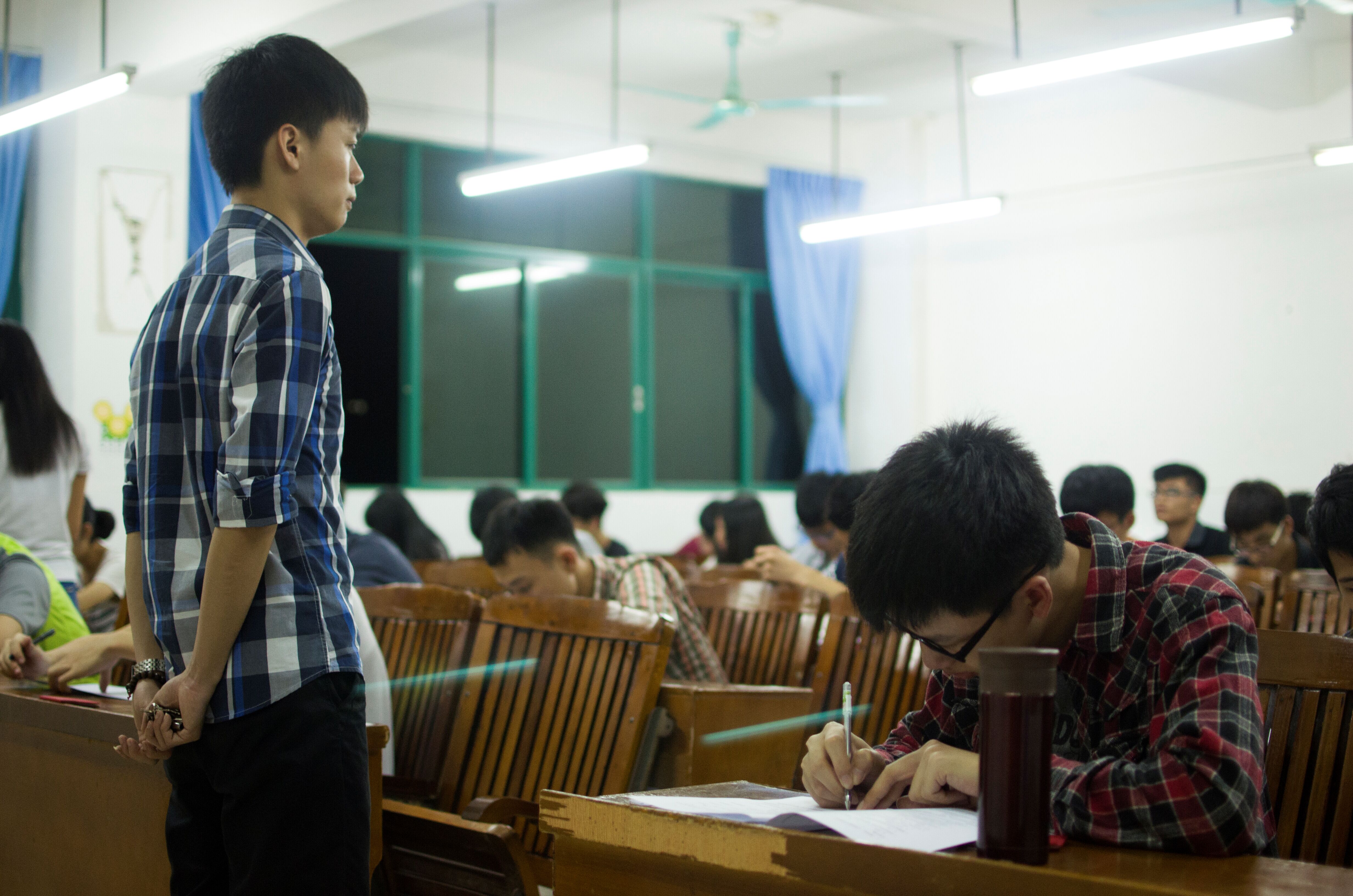 辅导员在巡视考场,考生们在认真答题