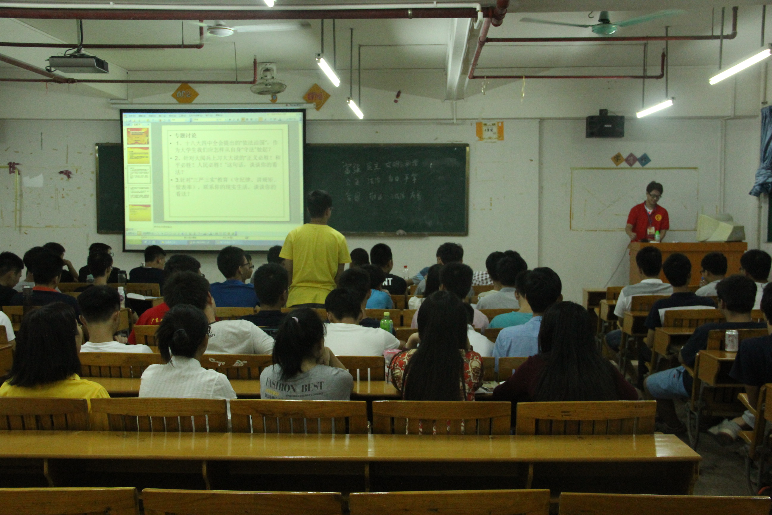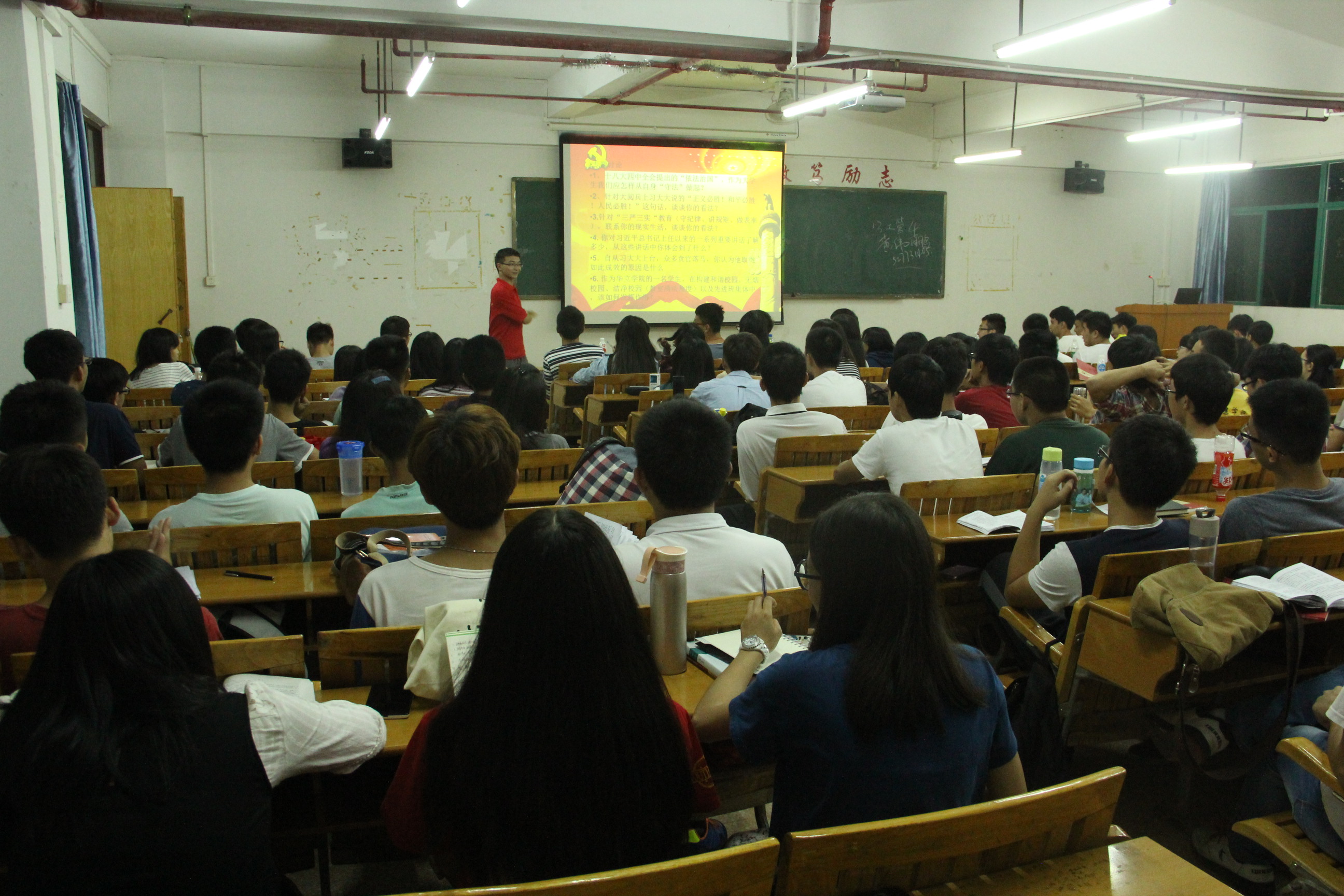 2015年10月20日晚7点,通过党课第一、二讲的学习,城建学部的党课学员们对党的十八届四中全会的方针政策有了初步的认识与了解,为了让学员们能更深入的了解十八届四中全会和了解社会中优秀党员的事迹,树立正确的人生观与价值观,提高自己的思想道德素养,党课第三讲采取播放优秀共产党员视频、城建学部党组织的介绍与总结视频与专题讨论的方式进行。