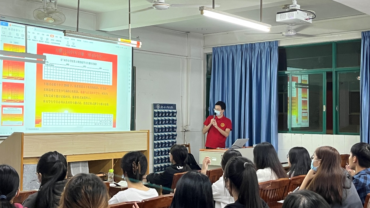 党务秘书说明了本次党校的相关工作安排,包括党校专题讨论的详细流程,党校培训的课程安排、内容、注意事项以及规章制度,其中重点强调了学员参加培训及考试期间的注意事项,并提醒学员们提前到场,培训期间认真听讲,做好笔记,严格遵守纪律,为党校考试做好准备。最后,党务秘书还对本次专题讨论的主题以及分组情况作了详细介绍。
