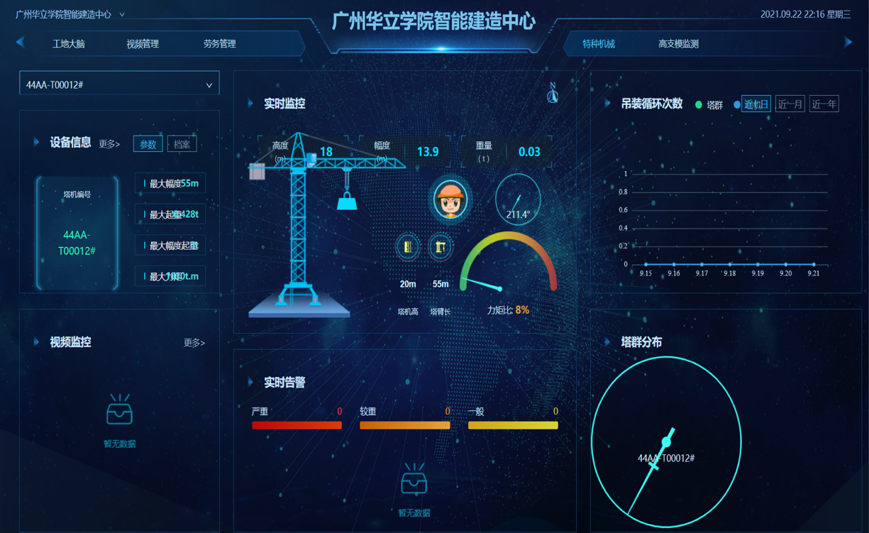 3.主要设备:Faro Focus三维激光扫描仪、物理沙盘(沙盘模型)、拼接大屏(LCD拼接屏)、VR行走平台、BVP3D-BOX多功能3D全息交互台、塔机安全监控子系统、施工升降机安全监控子系统、监控中心子系统、高支模监测子系统、临边防护监测子系统和3台电脑等。