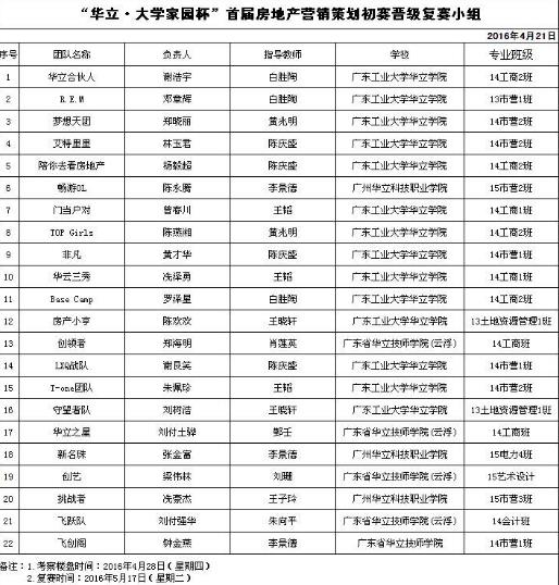 “华立•大学家园杯”房地产营销策划大赛入围复赛队伍名单公示 作者:土木系 发布时间:2016-04-25 00:00:00 浏览次数: 次 【字体:小 大】 各学部: 经过大赛评委团评审,现将入围“华立·大学家园杯”首届房地产营销策划大赛复赛团队的名单公示,组委会将于4月28日组织各复赛参赛团队前往云浮“华立·大学家园”项目楼盘进行实地考察,请各入围复赛团队提前做好相关准备。入围队伍名单如下: 广东工业大学华立学院创业办 2016年4月22日 分享到: 【打印正文】