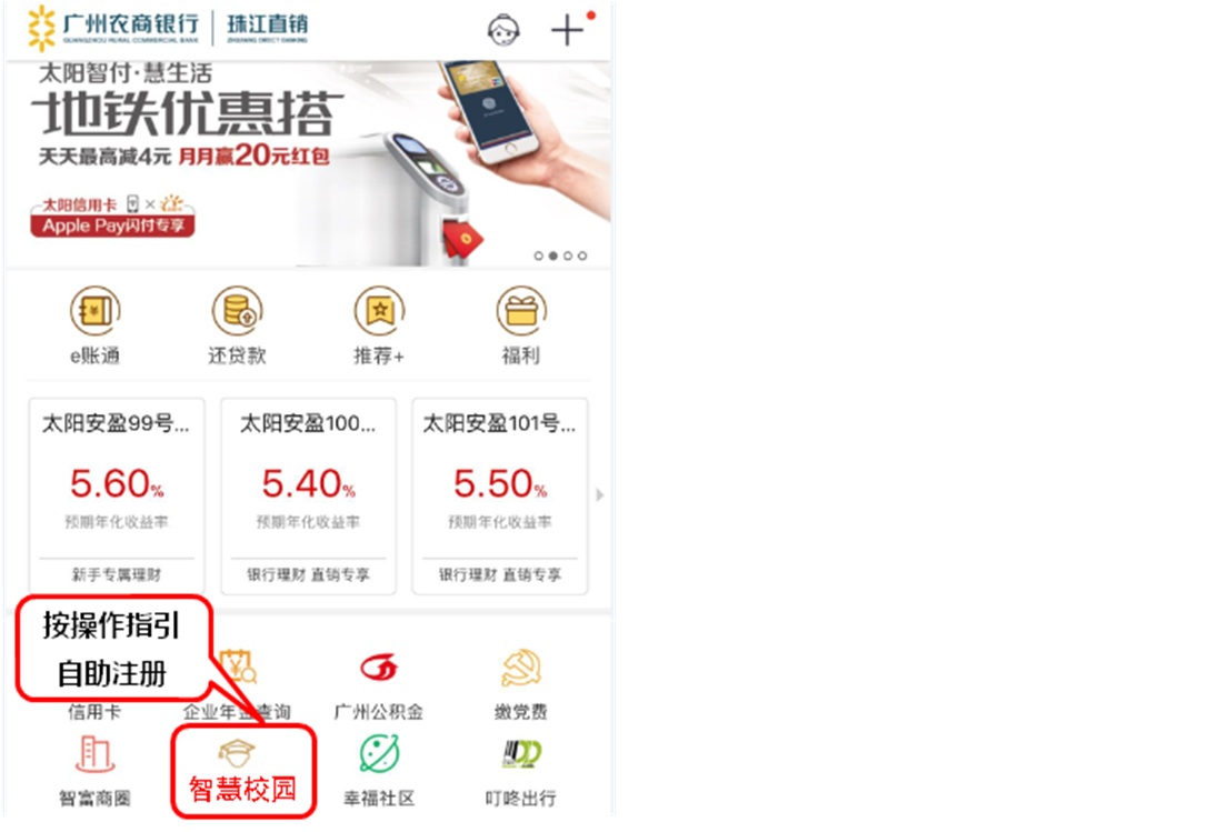 1、扫描下方二维码,下载安装【珠江直销银行APP】,点击【首页-智慧校园】