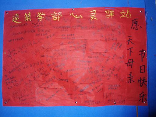 2008年5月7日,为庆祝即将到来的母亲节,心灵驿站和女生部一起举办了一个十分有意义的活动。活动分两个环节:一是,签名留言;二是,为母亲寄贺卡。 活动一是在第二教学楼门前举行,让建筑学部的同学们甚至学院所有同学将所有想对母亲说的话语写下,以表达对母亲的祝福和感激。整个活动过程中,同学们都积极参与。祝福语写满一张又一张的白纸。虽然都是些简短的话语,却看出了同学们那份强烈的心意。即使我们在学校,不能陪同母亲一起度过节日,但借此字句相信母亲也可感受到我们的祝福。看着同学们热情写下的字句,真的十分感动。一句句“母亲节快乐”、“身体健康”等的话语一次又一次地映入眼中,是的,这一切都是我们的心声,都是我们共同的愿望。愿母亲每天快乐。 活动二是组织同学们填写卡片,为自己的母亲寄上一份真诚的祝福。两个部门的成员分好任务,让一些同学负责买卡片,一些同学负责发卡片让同学们填写,一些同学负责联系邮局把卡片寄出。整个活动在有序的安排和同学们的配合下顺利地进行并完满结束。让同学们可以为自己的母亲献上最真挚的祝福。 感激母亲的照顾与关怀当然不只有在母亲节这一天。对于育我们成材的母亲,我们对其的感谢又岂止这一天足以表达?我们对母亲应时常怀有感激关怀之心。 本次活动,让我们在日常学习生活中不忘母亲恩情,学会感激母亲为我们的无私付出以及无微不至的关怀。母亲是伟大的,活动是难忘的。