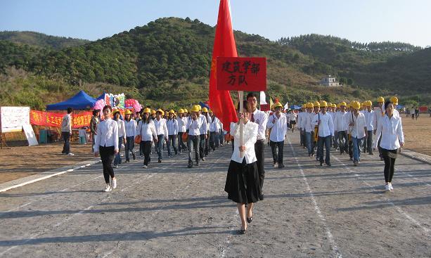 不一会儿,建筑学部的代表方队迈着整齐的步伐走向主席台,一身标准的特色服装,头顶安全帽,手拿测量仪,无疑向其他人说明他们是一支出色建筑队伍,随着阵型的散开,一副巨大的华立学院俯视图如瀑布般由上而下倾泻而出,同时而至的还有震天的礼炮声,全场一片欢呼!
