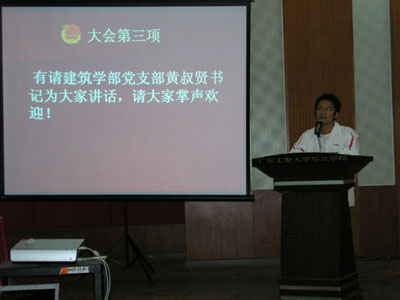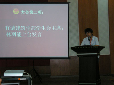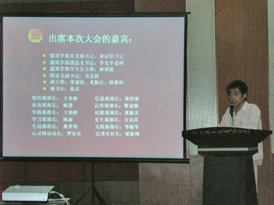 这次大会的主持人是07届工程管理1班的徐磊,在主持人的介绍下我们知道出席大会的嘉宾有建筑学部辅导员陈静、党支部书记黄叔贤、团总支书记李光华、建筑学部学生会主席林羽能、副主席李嘉欣和邱秋旺、秘书长张彦和建筑学部各部部长以及副部长。而参加此次大会的还有建筑学部志愿者、公共基础学部干事和各班班干。
