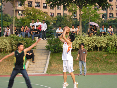 当天下午四时,本次大赛的冠军与季军争夺战正式拉开了续幕。计算机与艺术学部与思政学部争夺本次大赛的冠军,我学部与管理学部争夺本次大赛的季军。不幸的是,我部女子篮球由于在本次比赛中发挥不佳,所以未能参加本次大赛的奖杯争夺战。本次大赛战况十分激烈,不少观众都在下课后连饭都没吃被吸引过来。观众们在球场外围成了一排又一排的人墙。运动员们在场上挥汗如雨,奋勇拼搏,观众们则在场下喝彩连连,为选手们打气。