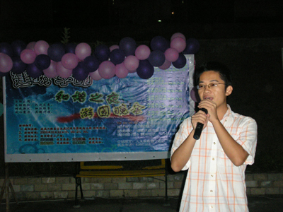 该晚19点,系部领导出现在我们的晚会表演台上。首先由李庆全书记对该次晚会致辞,他对本次游园晚会表达了高度的赞许。致词完毕,台上开始了一些让人振奋人心的表演,有系部艺术团街舞表演,文娱部部长演唱《酷爱》等。每个节目都引起了现场的阵阵掌声和高分贝的尖叫。