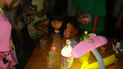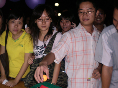 本次游园晚会的地点设在华立图书馆前,晚会由09级各班的摊位活动组成。摊位分成八个,每个摊位都设有自己的游戏。踩气球,捞金鱼,盗墓迷城,玩转魔方,手语猜词,吹蜡烛等等,每个摊位的奖品都很吸引人,而且都布置得十分漂亮,这令很多同学在晚会没开始之前便已跃跃欲试。