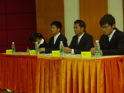 下午4点,决赛正式开始,一袭白衬衫的工管(6)班洋溢着儒雅的大将之风,沉着自信。而工管(1)班则一身黑色西装彰显着一股刚猛的气势,预示他们即将发动的凌厉攻势。