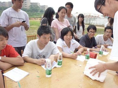 “鸡蛋撞地球”比赛的投掷场地——足球场边的甬道旁拥满了来参观和加油助威的同学,老师们也驻足观看。本次裁判组有:建筑学部团总支学生会书记唐丰老师,副书记黄传金,以及学生会副主席叶超贤和麦学灿。