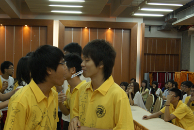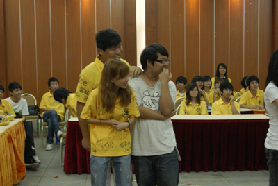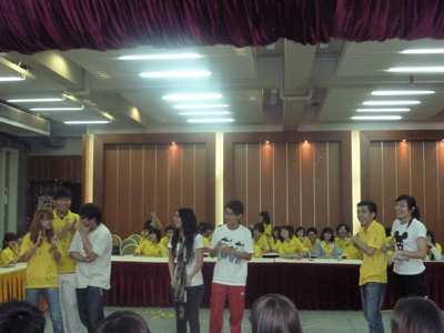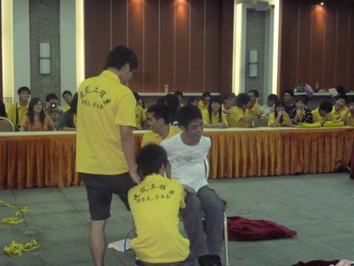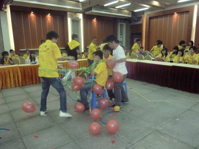 晚会共由4个游戏组成,分别是:团体体验赛,一猜你就中,金鸡独立和疯狂的凳子。特别是团体体验赛,不仅表现出干事们的团结性和效率性,还展出他们的敏捷速度和比赛技巧。在比赛进行的时候,整个会场被掌声、尖叫声淹没了。最后比赛由组织部组成的第一小队笑到最后,而由文娱部和外联部组成的第四小队则输掉比赛,遭到了游戏惩罚。随着游戏不断进行,现场气氛也持续上升,晚会雀跃的气氛此起彼伏。到了第四个节目时,由文娱部部长叶永桥同学和一些志愿上台献歌者为游戏伴歌,进行抢凳子环节,将本次晚会推向高潮。