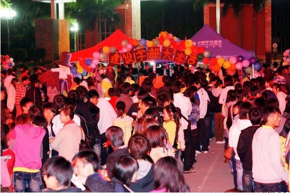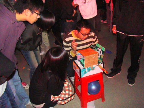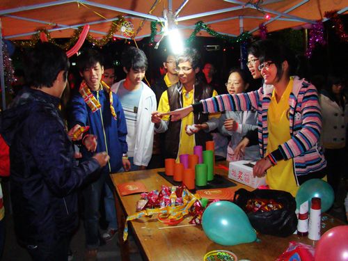 一号摊位的猜歌唱歌,听着熟悉的旋律,猜出名字,再深情哼上几句,不时的会有歌声穿梭在吵闹声中;二号摊位的有缘相聚,参与者绑着爱心卡片,在夜晚的人群中寻找着学院的有缘人,找到相同的号码,便能一起抽奖,不知又有几个能找到;三号吹蜡烛,无论男女,只要你有足够的肺活量,把点着的蜡烛吹灭,就能赢得属于你的奖品;四号的吹乒乓球这不只要靠你的吹气大小,还要靠技巧,把乒乓球从一个装满水的杯子吹到哦另一杯子,一旦不小心就会把乒乓球吹落桌上,那就输了;五号的蒙眼背人过关,团队活动,有背上的人告诉你该往哪走,那你就必须有很好的方向感,要不然就会闹笑话;六号摊位充满野性的拳王游戏,体验野性的活力,发泄心情,激发激情;七号用自己搞怪的舞蹈吸引游人,通过行动,努力证明自己的独特:八号的塔罗占卜,神秘的塔罗牌,吸引他人的眼球…