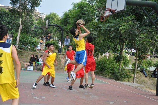 在裁判员有力的掷球下,身穿火红战衣的11级建筑3班和金黄的11级工管6班首先开始了比赛。比赛第一节,双方都表现出各自的出色的球技。但是,建筑3班球员之间的完美配合,使他们率先在第一节拉开比分,22:5,建筑3班领先17分。其中最精彩的就是红衣1号球员郑卓雄了,在第一节中,他带领球队一路领先。