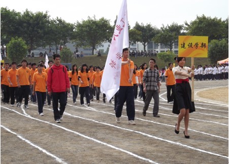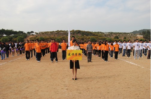 下午阳光和煦,秋风送爽,体育场早已人声鼎沸,各学部代表早就在指定位置集合。随着主持人宣布开幕式开始,国旗手首先庄严地护着国旗进场,接下来,各个学学部的方阵以最完美的姿态向观众展现他们的飒爽英姿,翩翩风采,从容迈入会场。最引人注目的是建设学部方队,整齐的步伐,充满个性的橙色服装展示出建设人朝气蓬勃,奋发向上的风貌。当走到主席台前建设学部方队用强而有力的声音喊出口号“强身健体,奋勇拼搏,看我建设,气势磅礴” !把开幕式带进高潮。入场完毕,全体起立,升国旗、校旗,庄严的气氛弥漫整个运动场。在领导洋溢的讲话、运动员代表和裁判员代表宣誓后,开幕式结束,比赛正式开始!全场沸腾,欢呼声、笑声、议论声凡所应有无所不有!