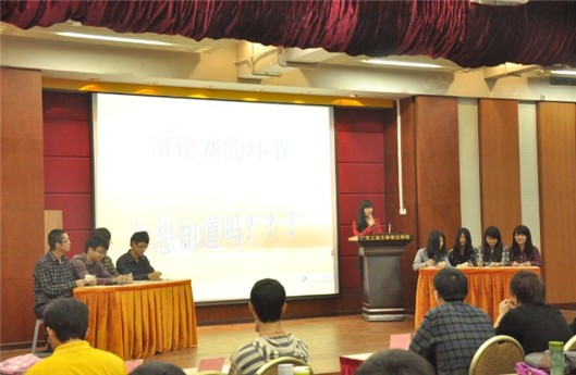 首先进行的是建设学部辩论队的精彩辩论,由徐启波师兄带队的正方全男队对阵由罗韬途师姐带队的反方全女队。一开始开篇立论,正方通过滑稽的语言和拍拖会使人麻木的观点坚定认为正方是正确的,反方则用简练的历史事实来反驳。全场给予热烈的掌声。
