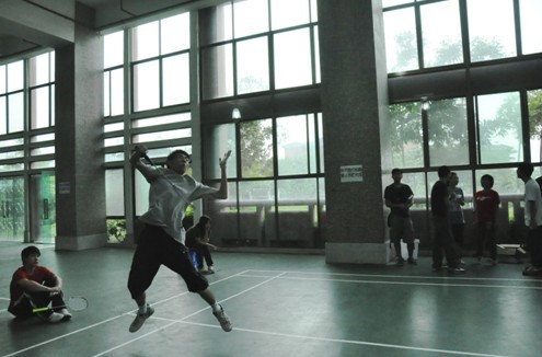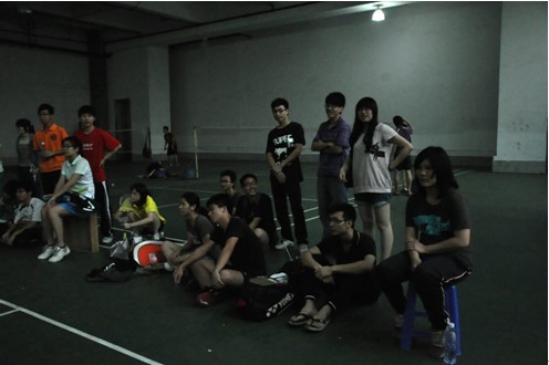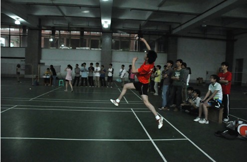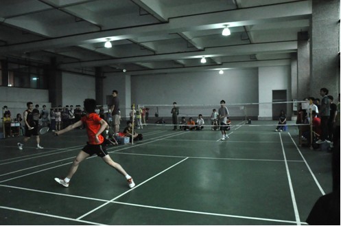 2012年4月23日星期一黄昏,在图书馆羽毛球场正在举行两场激荡人心的羽毛球赛四强选拔。比赛分成男单、男双、女单、女双、混双五个组别,采取三胜二负制进行比赛,两场定胜负,可想而知比赛有多么的激烈。
