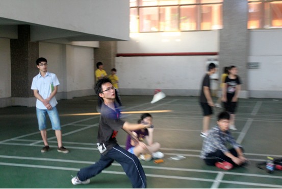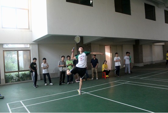 率先开始的这场比赛吸引了很多观众来围观,这是11工管6班和土木4班对11建筑3班和11土木3班的男单比赛。11工管6班的和土木4班的男单代表优美的动作给我们留下了深刻的印象,他很有气势。但是,来自11建筑3班和11土木3班的男单代表招招干净利落,连续拿下几分,第一局以13:21的比分结束,建筑3班领先一局。第二局一开始,11工管6班的代表开始提高警惕,第二局的比分频频打平,可是身穿黑色上衣的对手实在强大,在几次扣杀后,以17:21的比分再赢了一局。此刻,比赛结果已经很清晰了。11工管6和土木4班男单代表以2:0胜出。