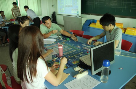 在正式上课之前,老师给我们做了个小游戏,名叫逆向思维,游戏规则是先猜拳,输的去抓赢的的手,相反,赢的就要避开。这个游戏需要有清晰的思维与敏捷的动作配合。同学们都积极地参与,使课堂气氛活跃。随后,进入正式的课程。这是一个模拟隶属于某建筑公司的工程项目部,完成承建公司指派的三个工程建设任务。