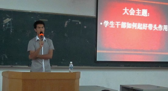 会议在主持人易敏靖的宣布下隆重的拉开了序幕,紧接着由城建学部团总支杨智末书记发表重要的讲话。他首先在黑板上书写了“学生干部”四个大字,并深刻的讲解了这四个大字的重要意义,他强调学生干部首先是学生,其次是干部,最后是学生干部,学生干部的作用是:服务同学,提高自己,奉献社会。