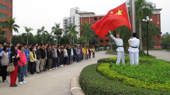在开学的十二周,城建学部举行了今学期第一次升旗仪式。尽管天气骤降,在早上6点45分,学生还是按时到达综合楼前的广场举行升旗仪式。各个班级的同学都穿上了各自的班服,有序的排列整齐,由系部学生会纪检部干事检查考勤并静待仪式的开始。
