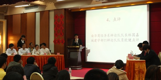 最激动人心的要数辩论赛环节了,本场友谊赛由华商经济系辩论队队长林国嘉,副队长黄宣澍,顾问罗坚锐以及华立城建学部辩论队队长何维,副队长杨子杰,顾问欧健担任评委。双方队员激情洋溢的自我介绍后就到了陈词立论环节当中,双方都利落地把自方观点阐述清楚;接着在充满攻击性的攻辨环节中,双方更是争锋相对,提出的问题层出不穷,陷阱重重,答方也捉住关键,句句见缝插针切中要害。随着进入自由辩论环节更是把整个比赛推上高潮,他们急中生智、随机应变见招拆招。台下的观众们被这精妙绝伦的比赛紧紧地吸住眼球。