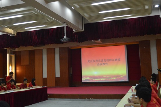 视频观看完毕后,党员代表宣读“党的群众路线会议报告”。