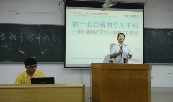 为了进一步加强学校学生干部队伍建设,提高学生干部的综和素质和工作能力,更好的开展学生工作,发挥学生干部“自我教育,自我管理,自我服务”的积极作用,广东工业大学华立学院城建学部学生会于2013年10月29日下午5点30分在第三教学楼408室举办学生班干培训。