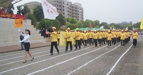 虽然下午的天气寒冷,但运动场上仍早已经人声鼎沸,各学部的方阵代表也早就来场上集合,做最后的排练。随着主持人宣布开幕式的开始,国旗手首先庄严地护着国旗进场。接下来,城建学部、机电与信息工程学部、会计学部、管理学部、外语外贸学部、经济学部和传媒与艺术学部等七大学部的方阵陆续进场,他们以最完美的姿态向观众展现他们飒爽的英姿,展现着他们积极的状态,他们成了观众们关注的焦点。而城建学部的方队穿着黄色的会服,戴着安全帽,踏着整齐的步伐,从容地迈入会场。更是引人注目的是当城建学部方队走到主席台前时,他们用强而有力的声音喊出“城建精神,坚毅过人,城建精英,敢闯敢拼”的口号。这个口号响亮的徘徊在运动场的上空。当所有学部方阵都入场完毕后,国旗伴随着国歌缓缓上升,庄严的气氛弥漫整个运动场。在领导的讲话、运动员代表和裁判员代表宣誓后,开幕式结束,比赛正式开始!