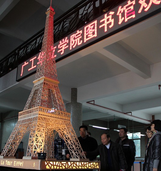 一走进图书馆大门就看到一座木制埃菲尔铁塔,这是14工作室的心血,那是他们花了一个月的时间做出来的作品。这是师兄师姐们毅力、细心、恒心的见证。欣赏完宏伟的埃菲尔铁塔向右转有更多的作品等着你去观赏,首先看到的是手画的图画,包括有个人的设计图,临摹图,还有考试的临场作品等等。旁边还有一些建筑模型:雅安震后重建抗震房、道格拉斯住宅、旋转中心、天鹅堡、广东省博物馆等。除了这些还有用电脑设计的各类建筑的设计图,其中有博物馆建筑设计、建筑碉塑博物馆方案设计、瓷都博物馆设计、医院门诊部方案设计、震后临时性建筑设计、绿色社区活动中心设计、派诺办公楼设计、山地旅馆设计、汽车客运站设计等等。