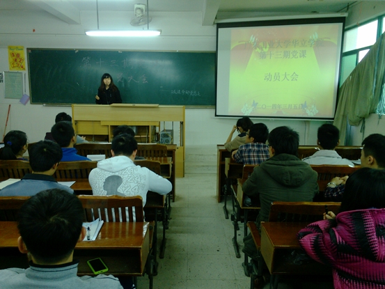 此次动员大会不但让同学清楚地认识到参加党课意义与重要性,而且让同学们更好地了解到党课的开展形式,为每一位党课学员顺利结业打下了良好的基础。在大会期间,同学们始终保持着良好的课堂纪律,希望在接下来的党课三讲中各个学员能学到更多党的理论知识。 城建学部党总支 二〇一四年三月五日 |