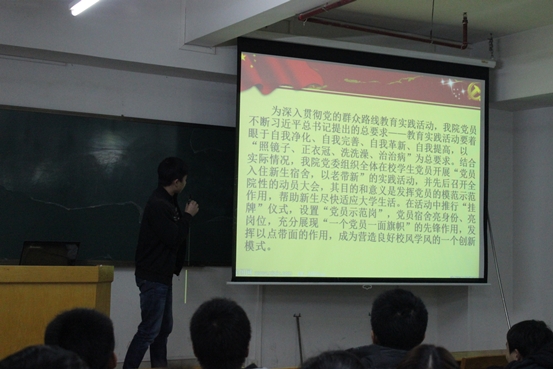继2014年3月6日城建学部党总支召开党课第一讲后,结合本学部的实际情况,2014年3月11日19点开展了党课第二讲。城建学部党总支部分党员分组给党课学员们讲授新的内容,包括深入学习党的十八届三中全会与了解党的群众路线教育实践活动。