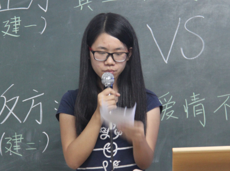 本次辩论赛的辩题为“真正的爱情一定是天长地久吗?”,正方是14建筑1班,他们的观点是“真正的爱情一定是天长地久。”,而反方则是来自14建筑2班,他们的观点是“真正的爱情不一定是天长地久,”。比赛正式开始,正反方先进行3分钟的陈词立论。之后,就到激动人心的攻辩环节。在此环节中,正反方的二辩先进行简单的攻辩。随后,反方三辨以幽默的问法调节全场的气氛,正方三辨也不示弱以犀利的言辞反击,比赛愈演愈烈。终于比赛进入了白热化阶段,自由辩论阶段,双方累计用时各为4分钟,而且是交替发言,一方时间结束,由另一方继续发言,观众也纷纷参与问答。比赛结束,由辩论队技术指导叶佳妮指出双方的缺点,以及宣布本场比赛的最佳辩手,分别为14建筑1班的三四辨,以及14建筑2班的二辨。最后,胜利女神的天平落在了14建筑1班这一边,同时也要感谢14建筑2班的精彩表现。