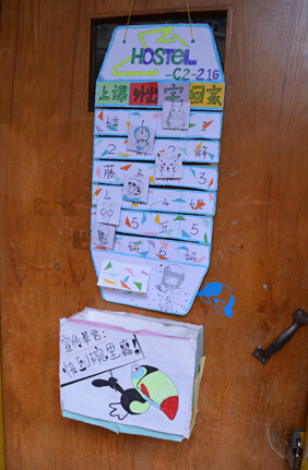2014年11月5日下午,宿舍装潢的评比就开始了。来到宿舍,门上的装饰让人眼前一亮,上面贴有温馨的小提示或画有精美的图画等,让评委们都有立即到宿舍里一探究竟的冲动。每个宿舍都有各自的风格,并且都干净、整洁,进到里面就让人感到舒适。装潢的材料也是多种多样:贴纸、折纸、墙纸、动漫海报等,把宿舍装饰得各有特色。男生宿舍多用动漫海报和贴纸装潢,而女生宿舍却多用漂亮的折纸、墙纸和其它精美小物品装潢。还有一些宿舍养了一些盆栽让宿舍添了不少绿色。宿舍的成员都热情地跟评委们介绍自己宿舍,认真讲解自己的设计构思。