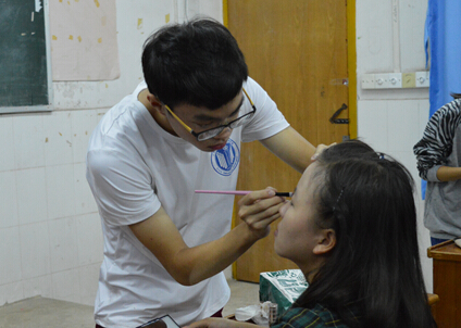 此次培训由女生部部长苏佩珊负责,培训分小组进行,每两个人一组,其中有男女搭配,也有女女搭配。在苏佩珊师姐为参与者简单地介绍化妆技巧后,各小组便进行“实战演习”,小组内两成员相互为对方化妆。在化妆时,每个人都表现得极为认真,目不转睛地看着队友的脸,小心翼翼地在队友地脸上涂抹着,装点着。在他们被化妆的时候也都非常配合,一动不动地好让队友可以专心化,队友间遇到不清楚的地方时也会相互指点一下。培训负责人也很负责的在旁边认真地看着,时不时地到各组进行指导,点评。休息时,各组之间也会相互评论、调侃,气氛非常融洽。