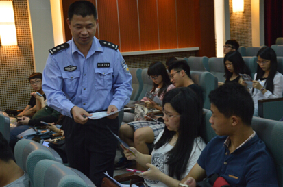 讲座中,钟伟新队长以非法营运车辆集中在学院周边接送学生现象引出话题,在非法营运车辆对个人和社会的危害性、交通部门严厉打击非法营运以及如何提高大学生的自我保护安全意识等方面依次展开讲解。他旁征博引,以详尽生动的事实与受害者惨痛的经历讲述了乘坐非法营运可能导致的后果和危害,警示同学们注意交通运输安全。李仕明警员则通过一段由电动车违章引发的一系列交通安全事故的视频来充分说明五类车(电动车、摩托车、三轮车、残疾人机动轮椅车、改装车)的危害性,让同学们知道遵守交通法律法规的重要性,警示大家交通安全关乎生命,并呼吁大家遵守交通法规,共同创造一个良好的交通秩序。他们通俗易懂的语言、典型形象的案例、细致全面的讲解得到了全体同学热烈的掌声。