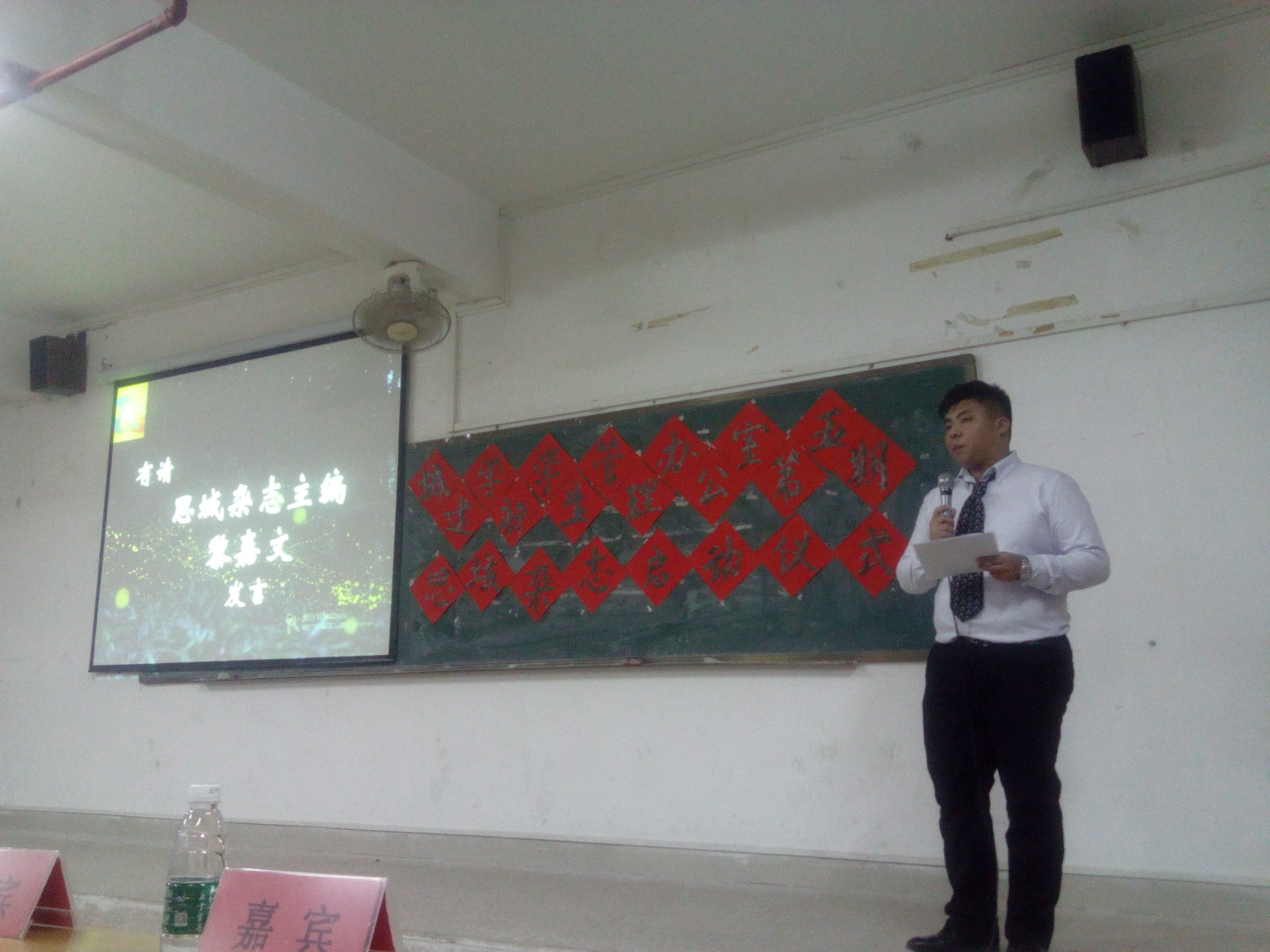接着由第五期思域杂志主编黎嘉文主编发表讲话,他简单地介绍了思域杂志的四期创办历史以及其“思考的领域”理念,同时,他提到第五期杂志主题“萤火”的寓意是“微微光亮引路人”,这喻示着一种团结的力量一直向前奔跑,代表着我们大学生要像萤火般展现自我,提升自我。