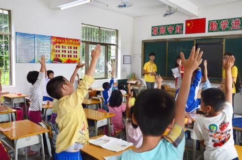 上课铃声响起后,志愿者分工有序地进入各个班级,跟同学们进行自我介绍,接着便和他们进行教学互动。在课堂中,志愿者们有教折纸的、唱歌的、教手语的等等,而在这些小朋友中,由于一些年纪都还很小,难免会比较活跃、调皮,但这都阻挡不了志愿者们的热情。虽然与孩子们有五六岁甚至十几岁年龄差距,但是一堂课下来,志愿者们与孩子们和睦相处,笑声充斥着整个校园。