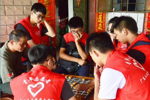第二天上午,志愿者们前往下一个目的地——增城葵湖村,对当地的贫困居民进行慰问。志愿者们来到了一户老爷爷老奶奶的家里,见到志愿者们到来,老爷爷很是热情,虽行动不便,但仍忙着给他们拿凳子坐,而志愿者也送上了他们准备好的米油盐等慰问品。接着志愿者们陪老爷爷老奶奶进行交谈,了解到他们二老的生活状况,儿女常年在外工作,而他们二老只能在这片乡村里靠种菜养家禽来解决温饱。随后志愿者们为两位老人打扫卫生,做了一顿丰盛的晚餐,陪着老人一同进餐,简单的举止,给他们送去一份真诚的关怀。