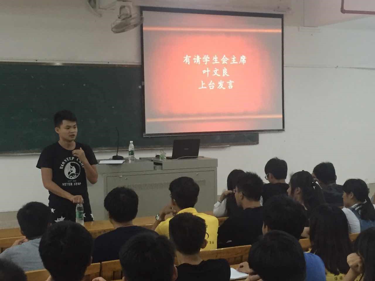 随后,15级班长代表陈超艺,15级的副班长代表廖鹏,15级的团支书代表司徒咏琳以及15级的学习委员代表罗晓鑫依次上台讲话,并对同学们各种各样的问题给出了自己的意见。