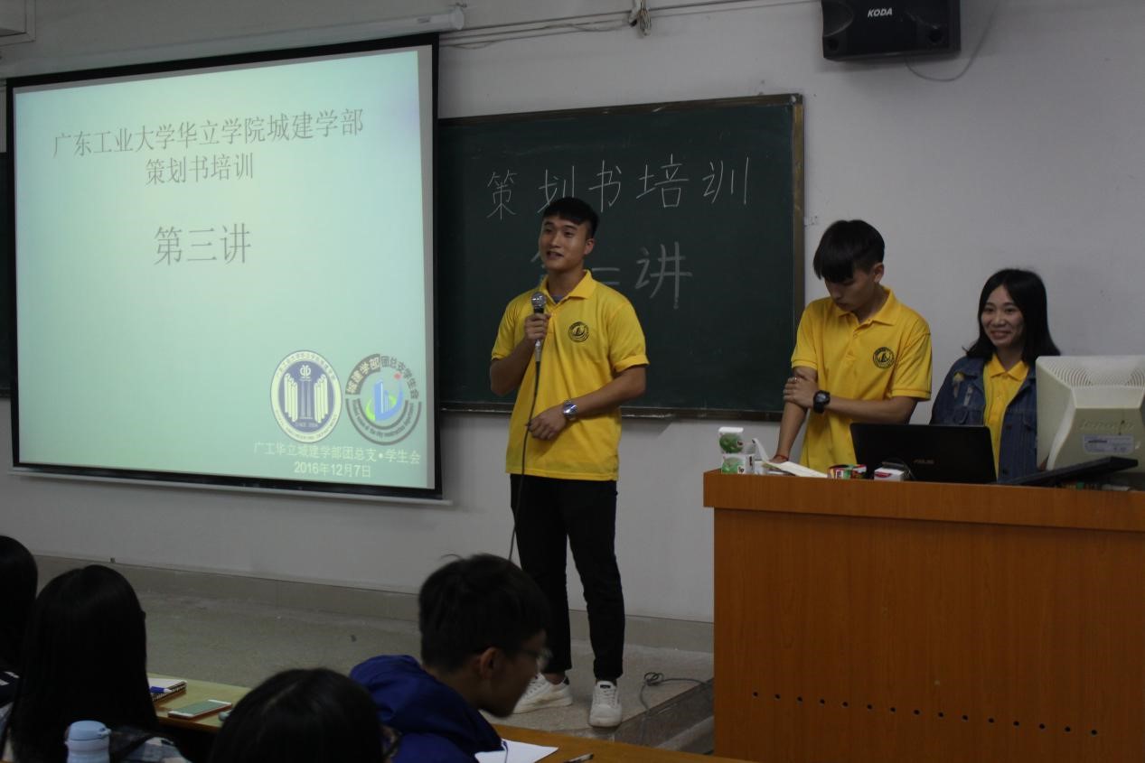 此次广东工业大学华立学院城建学部与2016年12月7日晚上7:00~9:00在五号教学楼207召开了策划书培训-第三讲。此次活动由秘书处的三位部长举办,目的是让到场的各个部门的干事能够了解怎么完成一篇策划书。