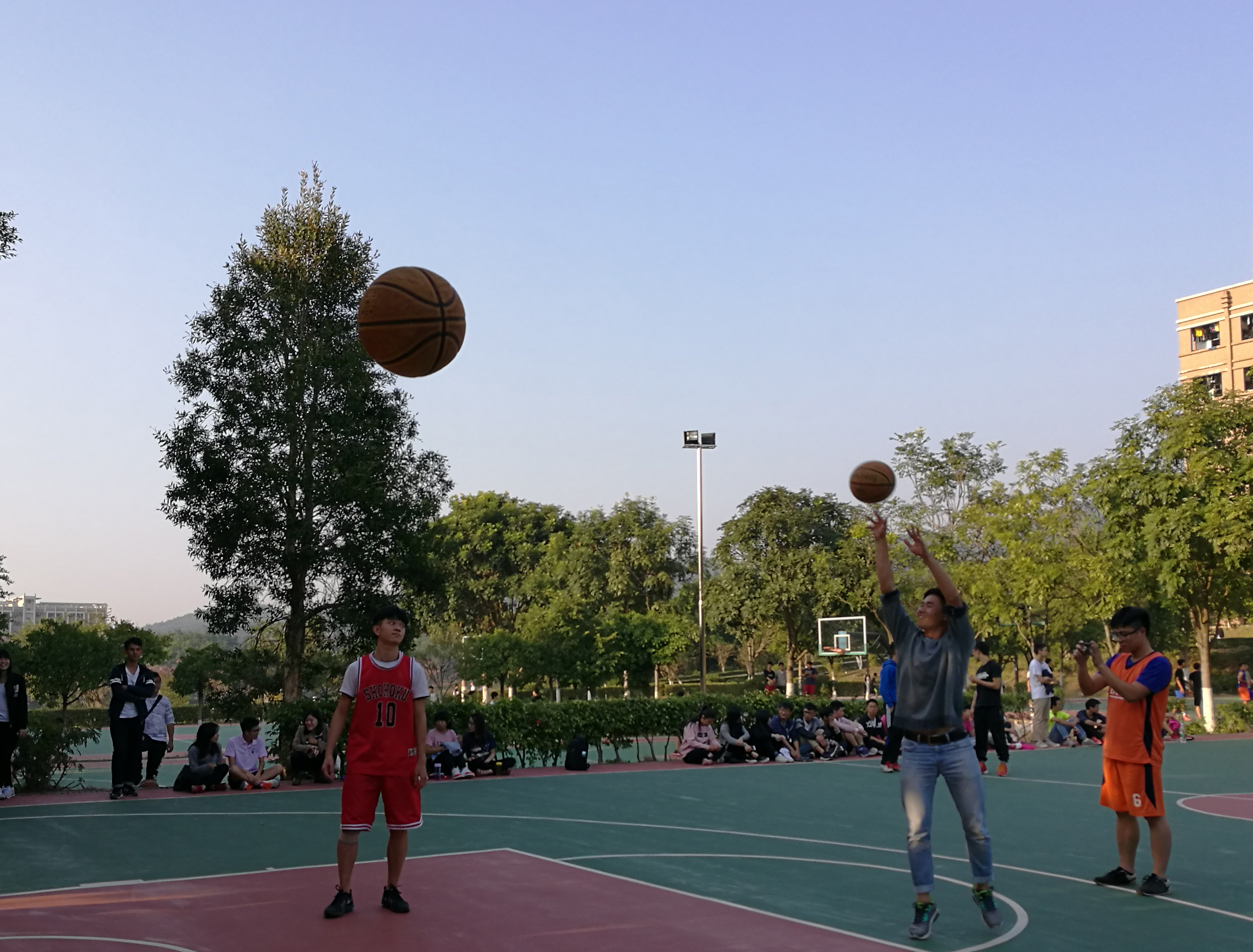 比赛热身阶段,球员和观众积极练习投篮。