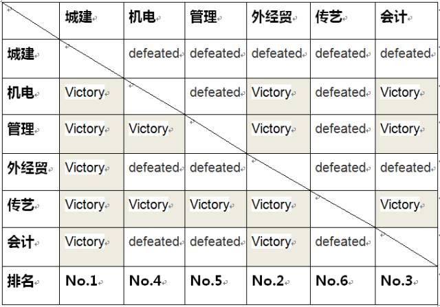 这次比赛采取了按胜学部数为第一评判名次的方法,赢得的学部越多,取得更好的成绩几率越大。