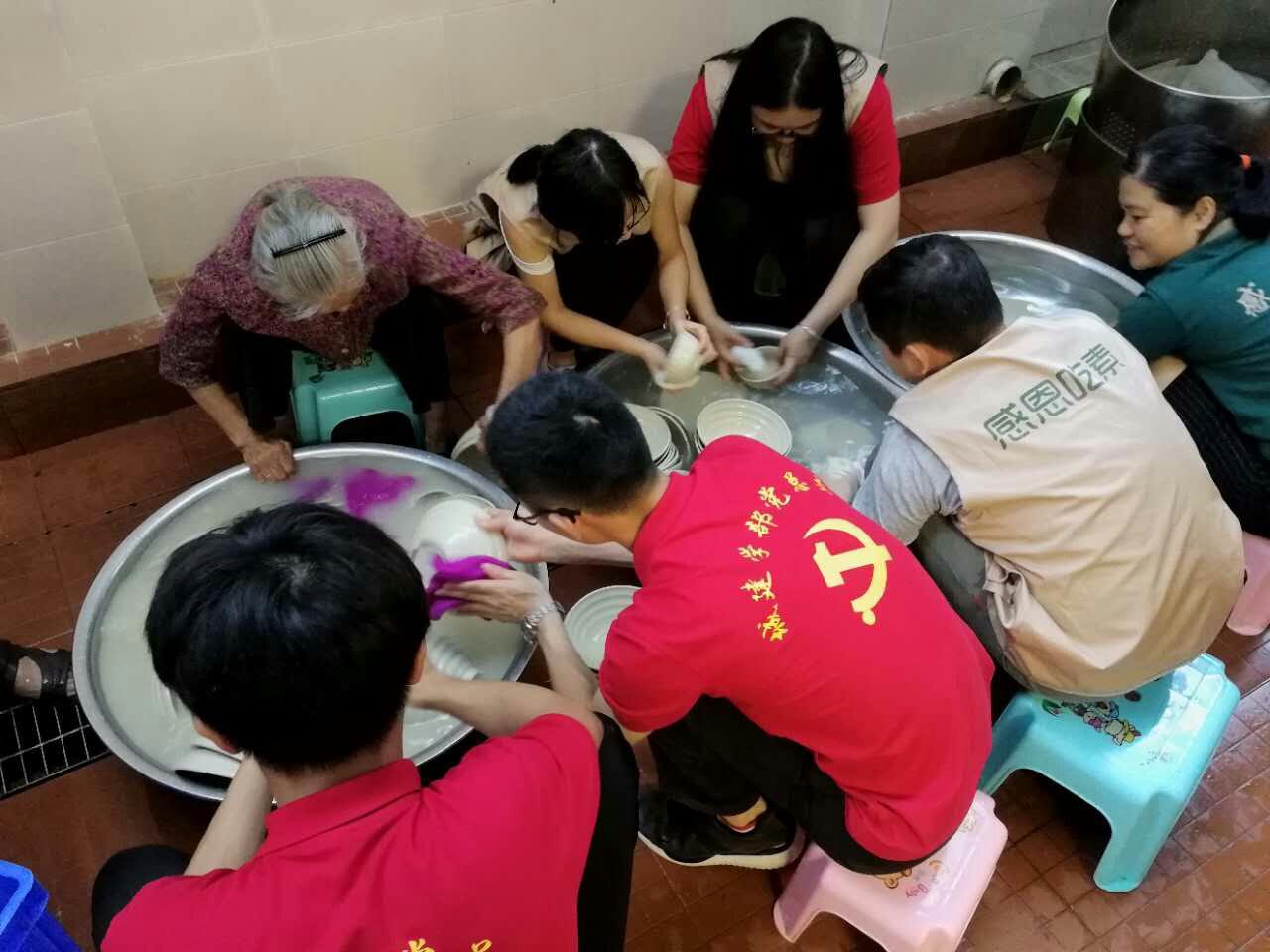 以此同时,一部分同志在后厨与工作人员一起洗碗,看到堆积如山的碗筷,实在惊人,让我们感到惊讶的是,我们竟然服务了这么多的群众,着实不简单,每当我们去到饭店用餐之后都留下了大量沾满油迹的碗碟,而在我们离开之后这些碗碟就只能落在厨房后勤人员的身上了,经过了这次活动也让参与的同志了解到了这些后勤人员日常工作的辛苦,培养了大家吃苦耐劳的精神。最终在大家通力合作下,很快就完成所有的工作。