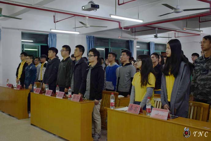 会议第一项,先由主持人宣布会议开始,全体起立共唱团歌。