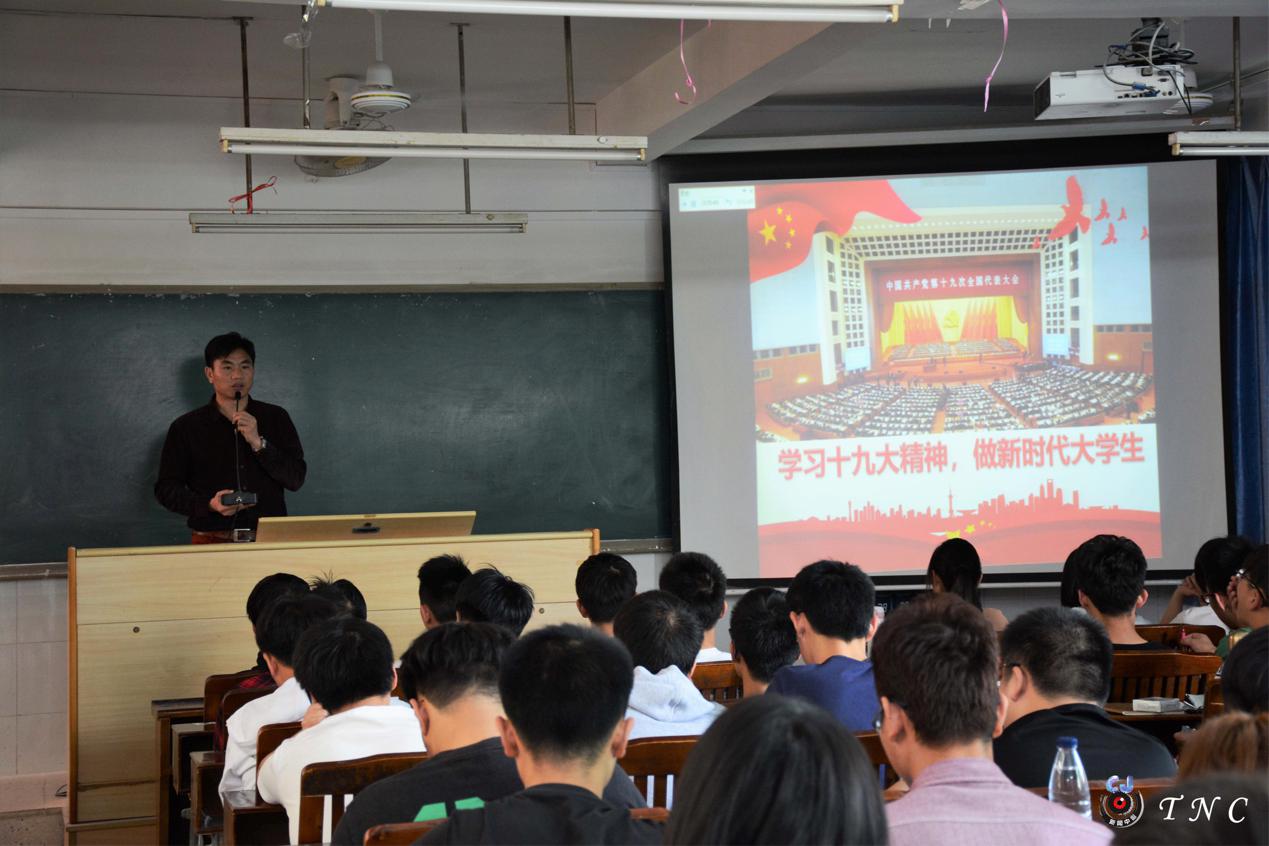 3月27日下午,学部党总支书记蔡凯武在2号教学楼208教室为17工程造价1班和17土木工程3班学生讲授“学习十九大精神,做新时代大学生”为主题的思想政治课。